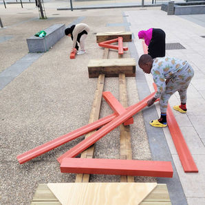 Projet d'aménagement du quartier ZAC-Horizon à Evry Courcouronnes, en préfiguration du nouveau quartier. Le diagnostique des usagers a révélé des besoins en assise, ombrage et jeux pour les enfants. Nous avons donc réalisés un banc ombrière autoporté, des mobiliers jeux d'équilibre et des modules pour vélo. Le mobilier d'équilibre s'inscrit dans un projet de réemploi en utilisant des matériaux utilisé lors du festival Bellastock à Evry.
